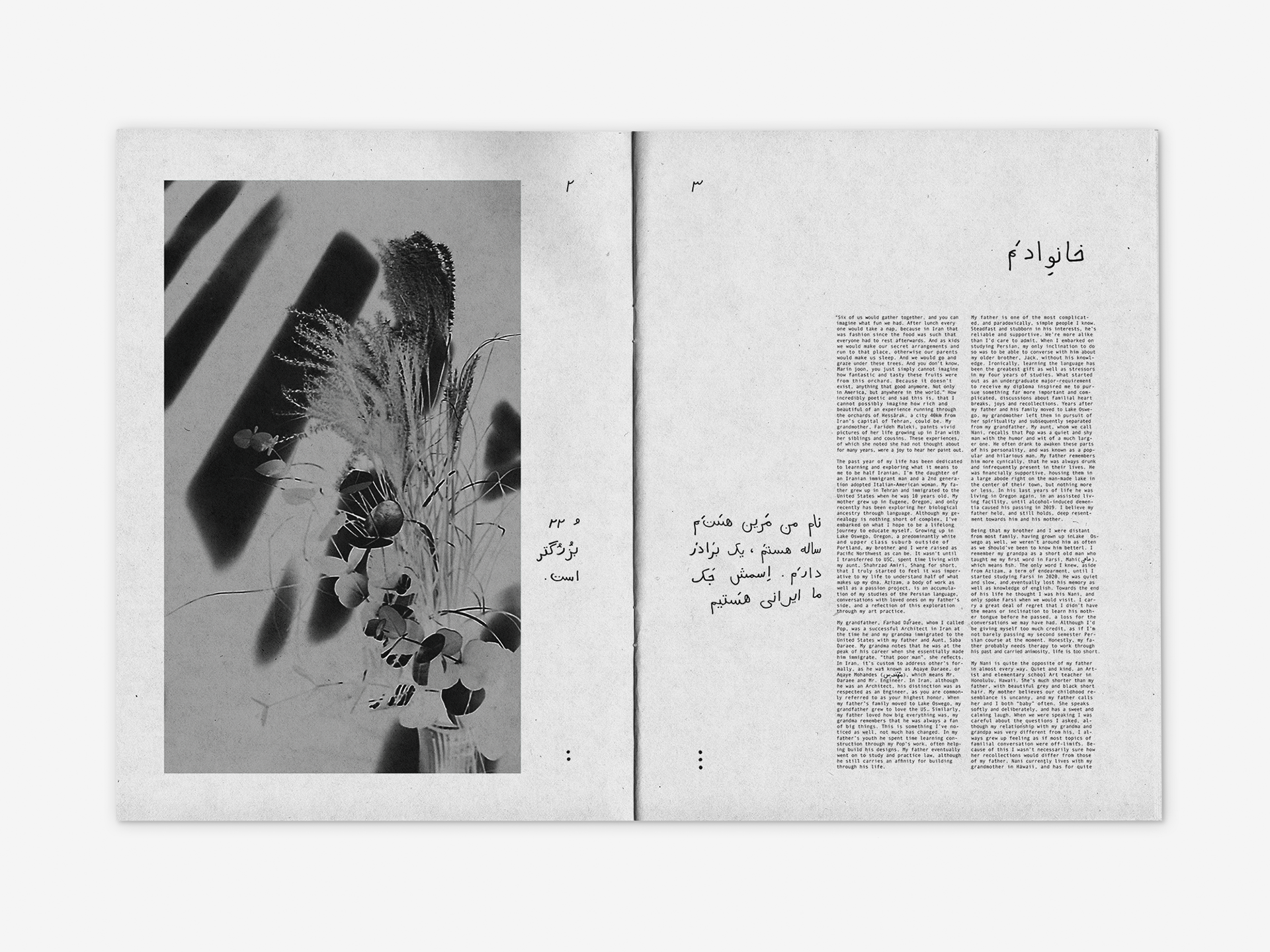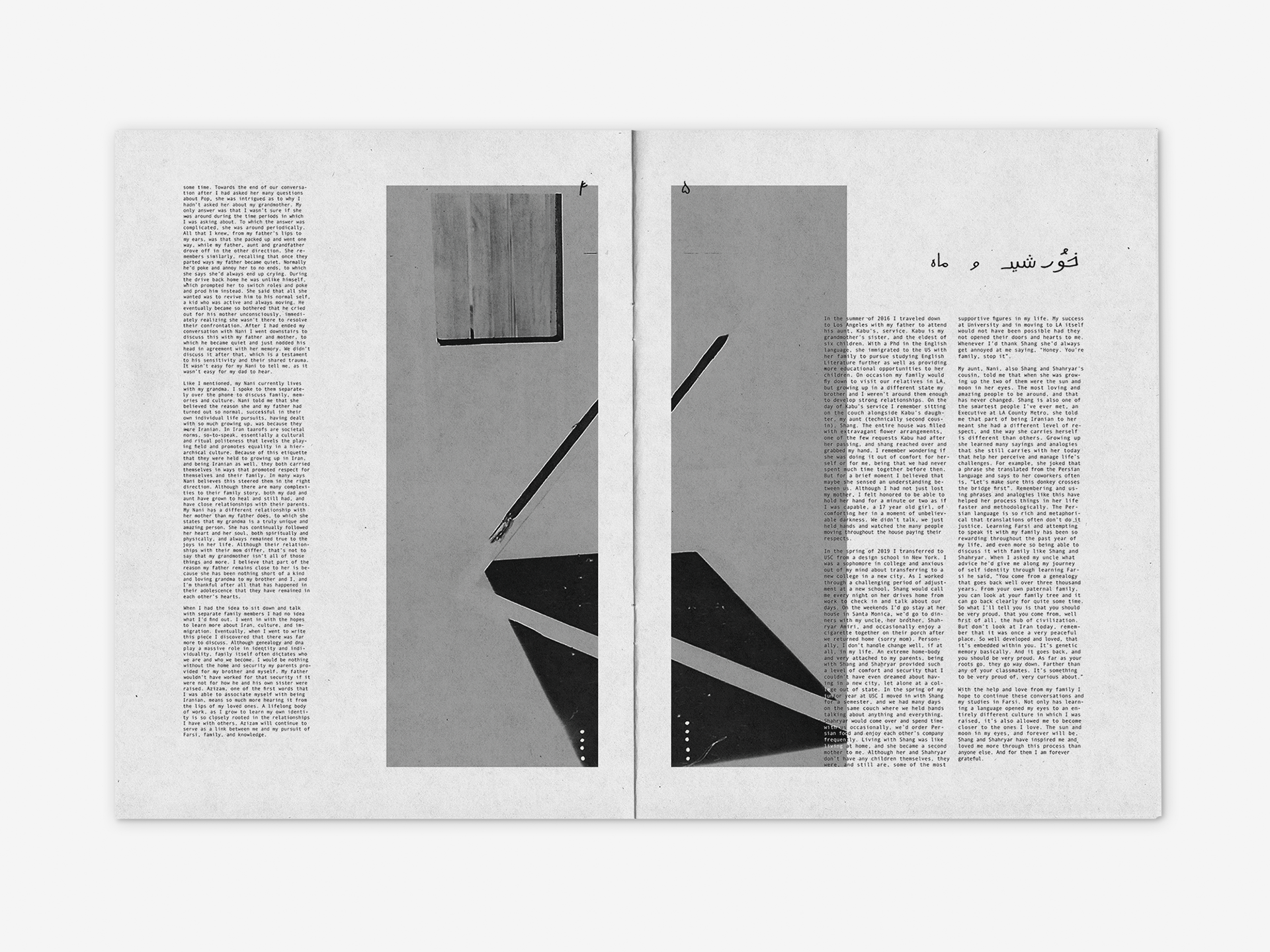 Digital Broadsheet -- 35mm B&W film still life negative photos accompanied by short essays written after interviewing my Iranian family members. (2021)